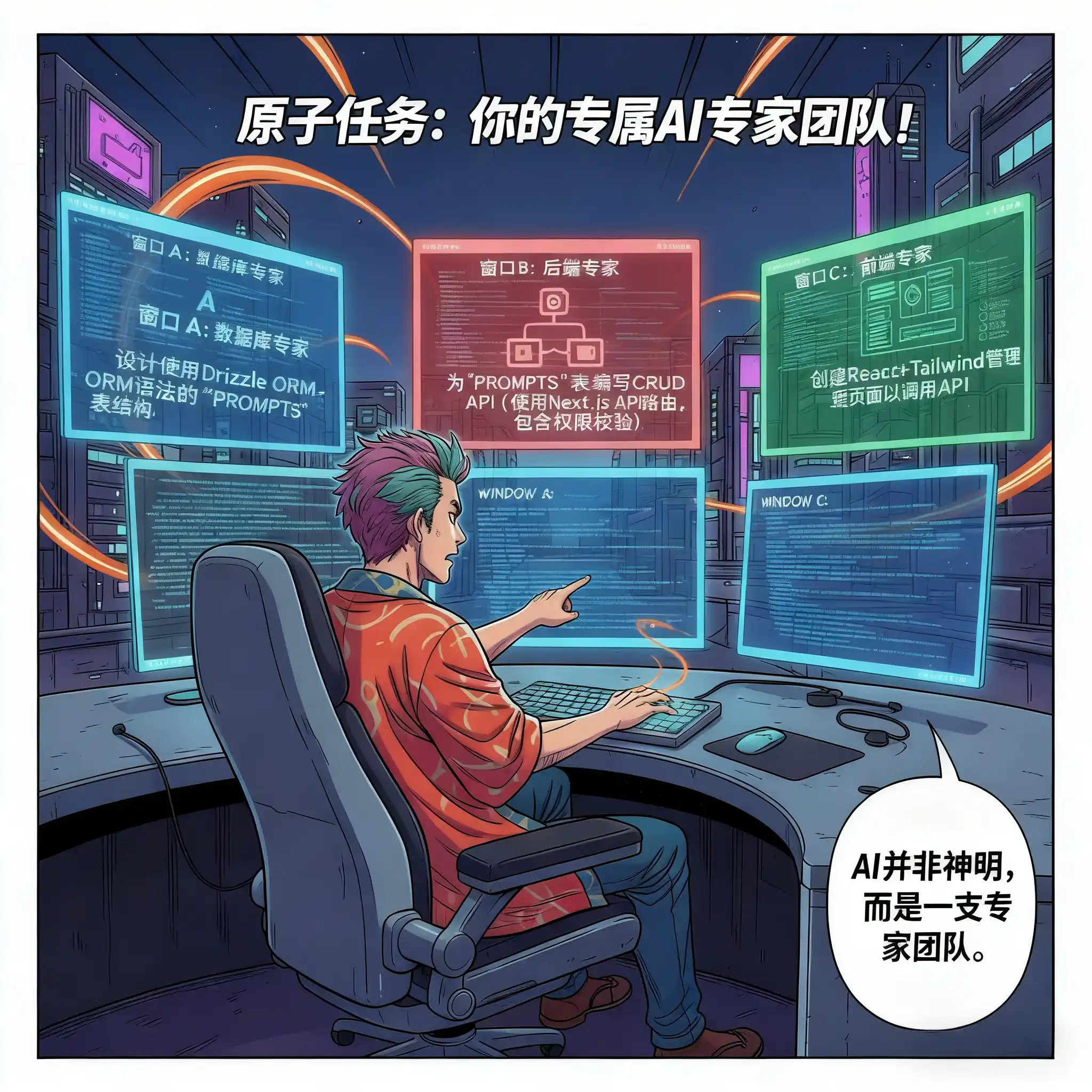 prompts表结构,用Drizzle ORM的语法写出来。”• 窗口B(后端专家):“这是表结构,给我写出对应的增删改查API,用Next.js的API Route实现,做好权限校验。”